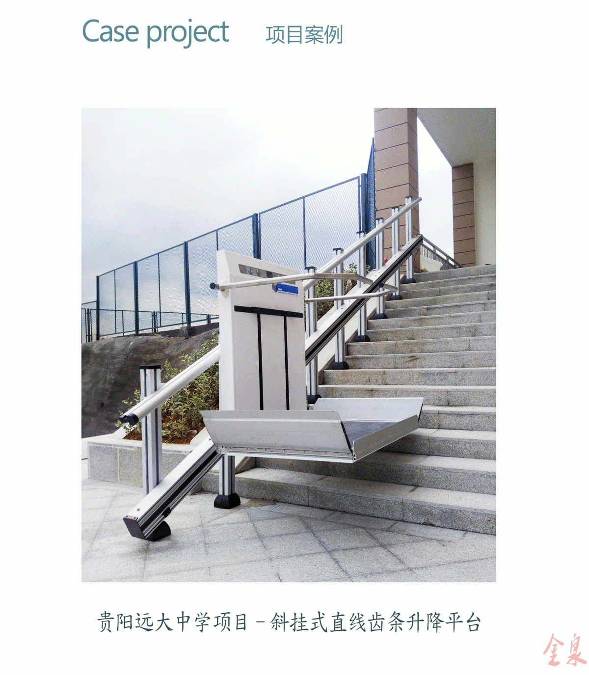 傾斜式無障礙升降平臺可安裝在室內和室外,可安裝在大型公共場所,如療養院,學校,餐廳,酒店,機場,地鐵,商場等。我們的斜掛式無障礙升降機平臺使用根據樓梯形狀設計的高精度導軌,可應用于直線,弧形,螺旋形樓梯。